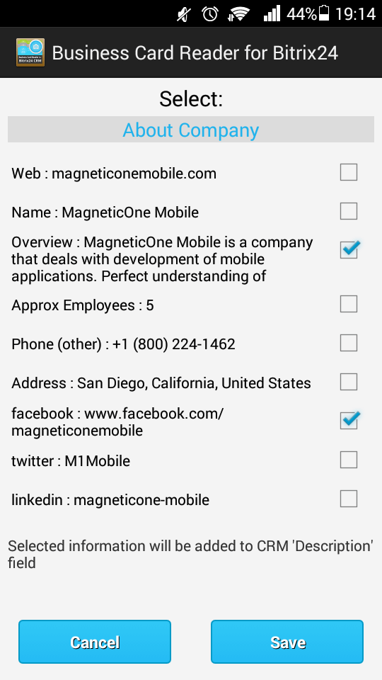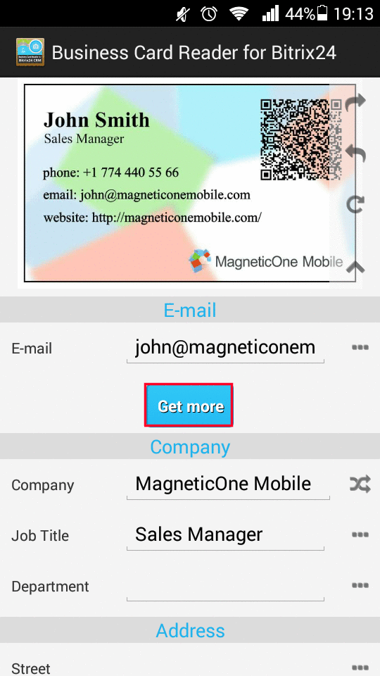 After you scan the business card info you are able to check the info plus insert new information. If you want to enrich data you need to click on “Get more” button. You can get additional person’s info: social network account, company name, department etc. You can choose from the list what data you want to add and click “Save”. All this information will be automatically added to your recognized info.